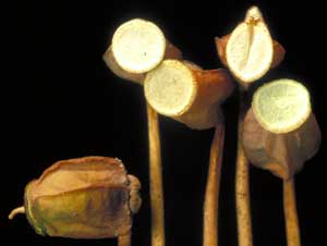 In each of Gemmabryum dichotomum (Bryaceae, Bryales) click for photo and Tayloria gunnii (Splachnaceae, Splachnales) click for photo the mouth of the spore capsule is surrounded by peristome teeth, which can help in spore DISPERSAL. Most members of the Bryopsida have spore capsules with peristome teeth. In Gemmabryum dichotomum the teeth are well-developed but in Tayloria gunnii they are rather small. By contrast the spore capsule of Physcomitrium pyriforme (Funariaceae, Funariales) click for photo lacks peristome teeth. The 2000 classification uses the nature (or absence) of the peristome teeth to help define the moss orders. One of the Gemmabryum dichotomum spore capsules is still in the process of shedding its operculum, the cap that covers the capsule mouth in developing spore capsules. You can see the annulus, a connecting ring of tissue between the operculum and the capsule, in the process of being shed. The 2000 classification explicitly uses the presence of a well-differentiated annulus to help define some moss orders.