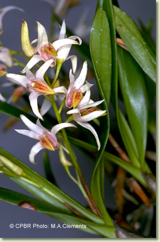 Epiphytic or lithophytic orchid forming spreading strands or tangled masses. Rhizome creeping, appressed to host, branched, 2.5-4 mm wide. Pseudobulbs widely spaced, ovoid to conical, short, 2-3.5 cm x 10-15 mm, yellowish green, hard, furrowed, sheathed in papery bracts when young. Leaves 1-2 per pseudobulb, erect, apical, sessile; lamina linear to narrowly oblong, 5-10 cm x 0.7-1 cm wide, dark green, thin-textured, leathery, sometimes twisted along length, apex unequally emarginate. Inflorescence a terminal raceme, erect to arching, 30-80 mm long, thin: pedicels 5-9 mm long. Flowers 5-10, resupinate, porrect, star-shaped, 8-10 mm wide, white or cream with orange or yellow labellum. Sepals and petals narrowly to widely spreading, narrowly triangular, apices acuminate. Dorsal sepal free, obliquely erect, 10-14 mm x 1.5 mm. Lateral sepals divergent, falcate, 12-14 mm x 2 mm, bases fused to column foot. Petals free, porrect, 10-14 mm x 1.5 mm. Labellum curved, elliptic, 14 mm x 6 mm, with 3 lobes; lateral lobes short, incurved; midlobe thick, noticeably longer than lateral lobes, orange with darker markings, with 3 slender ridges, apex acute. Column more or less straight, 2 mm long. Column foot curved, 3-4 mm long, at slight angle to column. Capsules pendulous, dehiscent.