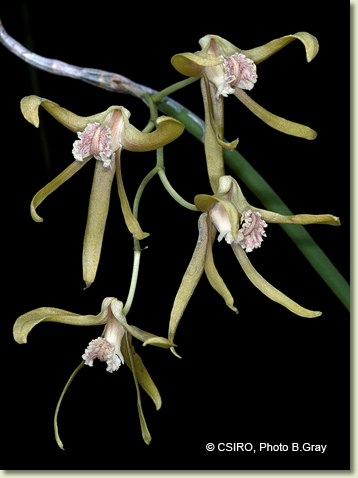 Epiphytic or lithophytic herb forming slender, pendulous clumps. Stems pendulous, to 200 cm x 3-4 mm, straight, dark green to yellowish. Leaf terminal on stem, pendulous, sessile; lamina linear to terete, 15-60 cm x 0.35-0.5 cm, dark green, fleshy, not grooved, apex obtuse to acute. Inflorescence an axillary raceme, erect, from node near leaf base, 40-60 mm long, wiry; pedicels 9-12 mm long, filiform. Flowers 5-8, moderately crowded, non-resupinate, porrect to nodding, star-shaped, 35-45 mm x 35-45 mm, yellowish to brownish yellow or orange-brown with red central stripes and whitish labellum, strongly fragrant. Sepals and petals widely spreading. Dorsal sepal erect to obliquely erect, narrowly lanceolate, 17-20 mm x 3-4 mm, constricted near base, apex obtuse. Lateral sepals divergent, asymmetric, lanceolate, falcate, 14-16 mm x 4 mm, bases fused to column foot, apex acute to cymbiform. Petals obliquely erect, linear, 18-20 mm x 2-2.5 mm. Labellum curved, 16-19 mm x 6-7 mm, pubescent, 3-lobed; lateral lobes erect, triangular, embracing column; midlobe intensely undulate, apex shortly caudate; upper surface with 3 dark red undulate ridges. Column porrect from end of ovary, 5-6 mm long, anterior surface and margins pubescent. Column foot 4-4.5 mm, at an obtuse angle to column. Capsules pendulous, dehiscent.
