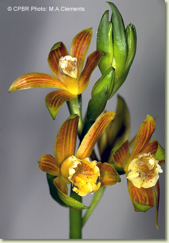 Terrestrial herb forming large clumps. Stems 3-6, erect, cylindrical to angular, 40-60 cm x 1.5-2 cm, fleshy, slightly swollen at the base. Leaves 3-5, erect, apical, petiolate; lamina lanceolate, 40-70 cm x 0.7-0.1 cm, dark green, pleated, thin-textured, apex acute to emarginate. Inflorescence an axillary raceme, 300-900 mm long, tough. Flowers 4-20, resupinate, porrect, star-shaped, 40-50 mm x 40-50 mm, internally brick red with yellow stripes, externally yellow. Sepals and petals spreading widely. Dorsal sepal obliquely erect, oblong to ovate, 35-42 mm x 10-12 mm. Lateral sepals free, divergent, porrect, oblong to ovate, 35-42 mm x 12-14 mm, apex apiculate. Petals widely spreading, recurved, lanceolate, 35-42 mm x 7-9 mm. Labellum unlobed, 15-17 mm x 13-15 mm, yellow inside, with scattered long hairs towards apex; basal margins tubular; apical margins undulate. Callus with 2 narrow parallel plates ending in series of overlapping blunt structures. Column 16 mm long, dilated towards tip, sparsely covered in short hairs. Column foot absent. Capsules pendulous, dehiscent.