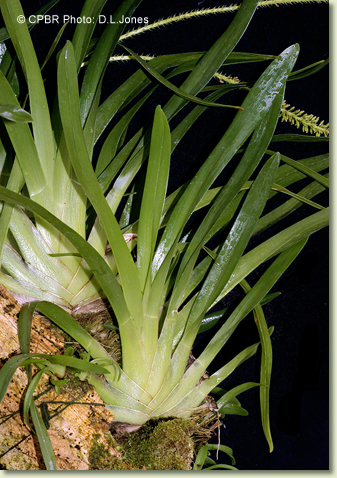Occurs in rainforests and coastal ranges at moderate altitudes, where it grows in humid airy positions on trees, and less often rocks. It is commonly found growing on mossy branches overhanging streams.