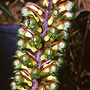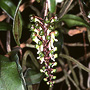 Epiphytic or lithophytic herb forming straggly clumps. Plants usually consisting of single main growth, sometimes forming sparse clumps with thick roots. Stems pendulous, 10-50 cm long, apex upcurved. Leaves 3-6 per stem, crowded, prostrate to pendulous, distichous, alternate, sessile, bases sheathing stem, imbricate; lamina narrowly oblong, 8-14 cm long, up to 3 cm wide, dark green, apex unequally emarginate. Inflorescence an axillary raceme, stiffly decurved, 10-15 cm long. Flowers numerous, crowded, resupinate, porrect, narrow, cupped, 12-14 mm x 4-6 mm, dark green with pink to red central areas and white to yellowish labellum spur. Sepals and petals not spreading widely, apices obtuse. Dorsal sepal narrowly obovate, 6 mm x 3.5 mm. Lateral sepals obovate, 5 mm x 3.8 mm. Petals elliptical, 5.5 mm x 3.5 mm. Labellum 5.5 mm x 3.5 mm, obscurely 3-lobed; basin-shaped with projecting beak-like apex; spur prominent, decurved, 12 mm long, distally bulbous, containing nectar. Column 3 mm long, projecting forward above spur opening. Column foot absent. Capsules porrect, dehiscent.