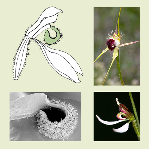 The way the apex of the labellum is held in relation to the rest of the labellum. If the flower is upside down (not resupinate) turn the flower up the right way (dorsal sepal at the top) when using this character.
