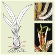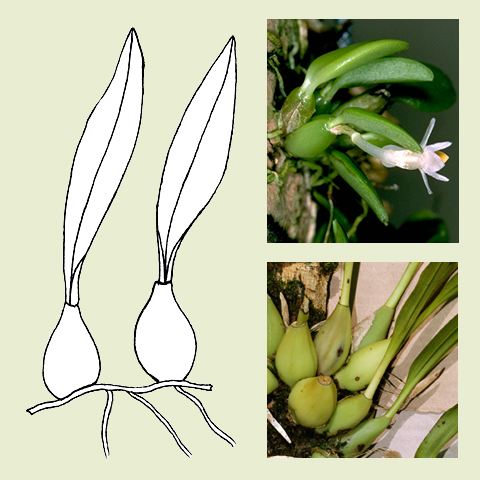 The presence of nodes on a pseudobulb is indicated by lines where bracts are attached. These lines on the surface are generally at an angle across the axis of the pseudobulb and become more obvious on older pseudobulbs where the bracts begin to break down.