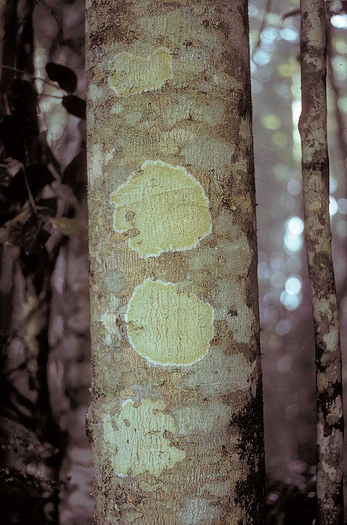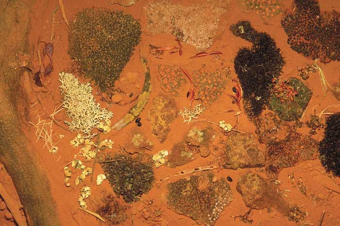 | Chondropsis semiviridis, a foliose lichen found on the ground in drier areas, is unusual in that it is not attached to the soil, but free. When it is dry it curls up, when wet it flattens out. | |
