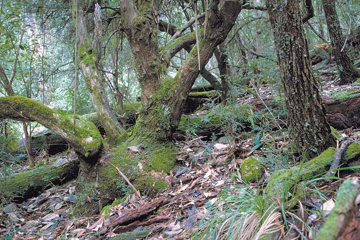 These are all typical lichen and bryophyte habitats. The fallen logs, scattered boulders, grass tussocks and so on create numerous micro-habitats that support a large variety of lichens and bryophytes.