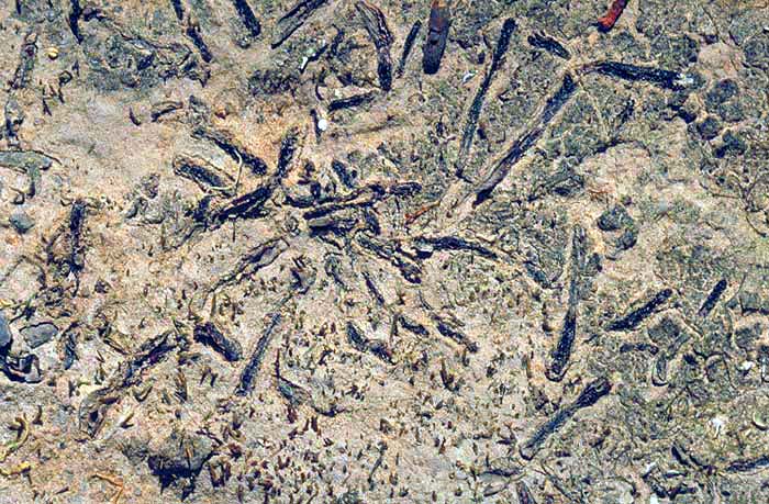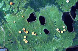 The green plants in this photo are Ricciocarpus natans, a thallose liverwort found in fresh water almost world-wide. Of the bryophytes, this species is the most adapted to an aquatic life.