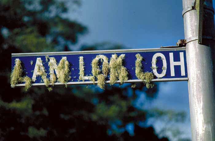 A street sign from Christmas Island in the Indian Ocean decorated with Usnea, a fruticose lichen.