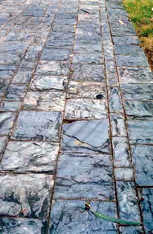 Anzac Parade, Canberra - scene and close-up of paver with crustose lichen Ramboldia petraeoides.The lens cap in the left view marks the location of the lichen.