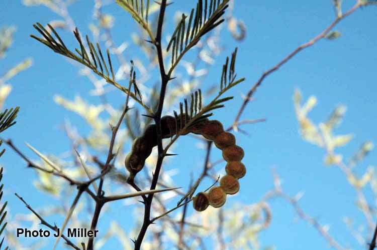 Large shrub to small tree 6 m tall. Bark dark gray to dark brown, smooth to shallowly furrowed. Twigs light to dark purplish brown, slightly flexuous, glabrous to densely puberulent. Short shoots sometimes present above the stipular spines particularly on slow growing branches, to 2 mm long, covered with acuminate stipules and old leaf bases, sometimes developing into long shoots. Leaves alternate, also occasionally clustered on the short shoots, 60-140 mm long. Stipular spines reddish brown, usually becoming light gray with age, symmetrical, terete to angular or rarely flattened, straight, stout, to 10(60)mm x 1.0-2.5 mm near the base, glabrous to puberulent at the base and sometimes throughout. Petiole adaxially grooved, 5-9 mm long, glabrous to lightly puberulent; petiolar gland solitary, located medially to just below the first pinna pair, sessile, circular to elongated, 0.7-1.8 mm long, apex usually depressed to rarely bulbous, sometimes puberulent. Rachis adaxially grooved, 30-135 mm long, usually lightly puberulent, a sessile, circular gland, 0.2-0.6 mm across, between the upper 1 to 3 pinna pairs. Pinnae (4)12 to 29 pairs per leaf, 18-31 mm long, 2.5-6.0 mm between pinna pairs. Petiolules 0.4-1.1 mm long. Leaflets 24 to 50(58) pairs per pinna, opposite, 0.4-0.9 mm between leaflets, linear, 1.5-4.1 x 0.5-0.8 mm, glabrous to lightly puberulent, lateral veins not obvious, only one vein from the base, base oblique, margins lightly ciliate, apex broadly acute to obtuse. Inflorescence a densely flowered globose head, 7-10 mm across, solitary (rarely 3) from the nodes. Peduncles 22-40 x 0.4-0.7 mm, usually lightly puberulent. Involucre 4- to 6-lobed, located at the base of the globose head, puberulent, persistent. Floral bracts spatulate, 1.3-1.9 mm long, apex puberulent, deciduous. Flowers sessile, pale yellow; calyx 5-lobed, 1.3-1.8 mm long, the lobes densely puberulent; corolla 5-lobed, 2.0-2.7 mm long, the lobes commonly puberulent; stamen filaments 2.5-4.0 mm long, distinct; ovary glabrous to lightly pubescent, on a stipe to 0.2 mm long. Legumes dark reddish brown, straight to slightly curved, flattened to elliptical in cross section, constricted between the seeds, oblong, 30-150 x 9-15 mm, coriaceous, reticulately striate, usually densely puberulent, eglandular, indehiscent; stipe to 6 mm long; apex acute, narrowing to a beak to 15 mm long. Seeds uniseriate, no pulp, light to dark brown, ovoid to nearly circular, strongly flattened, 5.3-7.3 x 4.0-6.2 mm, smooth; pleurogram nearly oval, 2.5-4.0 mm across. Flowers from September to February. Chromosome number: Not determined.