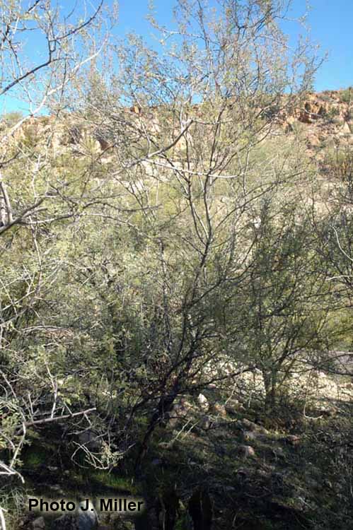 Shrub or small tree to 6 m tall. Bark dark gray, smooth to shallowly furrowed. Twigs dark purplish brown to dark reddish brown, not flexuous, glabrous to pubescent. Short shoots commonly present above the stipular spines, to 3 mm long, covered with acuminate stipules and old leaf bases. Leaves alternate, also commonly clustered on the short shoots, 12-35(40) mm long. Stipular spines reddish brown, usually becoming light gray with age, symmetrical, terete, straight, stout, to 15(38) x 1.2 mm near the base, glabrous to rarely lightly puberulent. Petiole adaxially grooved, 4-14 mm long, lightly puberulent; petiolar gland solitary, usually located at or just below the lower pinna pair, sessile to rarely stalked, circular, 0.2-0.7 mm across, doughnut-shaped, glabrous. Rachis adaxially grooved, 6-35 mm long, glabrous to lightly puberulent, a sessile, doughnut-shaped gland, 0.2-0.4 mm across, between the upper pinna pair. Pinnae 2 to 8 pairs per leaf, 5-12 mm long, 3.5-8.8 mm between pinna pairs. Petiolules 0.4-1.1 mm long. Leaflets 5 to 12 pairs per pinna, opposite to subopposite, 0.7-1.5 mm between leaflets, elliptic to oblong or oval, 1.5-3.6 x 0.7-1.3 mm, mostly glabrous, lateral veins not obvious, only one vein from the base, base oblique, margins usually ciliate, apex obtuse to acute. Inflorescence a densely flowered globose head, 5.5-9.5 mm across, solitary or in small clusters of 2 to 5 on the short shoots. Peduncles 11-26 x 0.2-0.4 mm, lightly puberulent. Involucre 4- to 7- lobed or scattered bracts located near the middle of the peduncle, lightly pubescent, usually persistent. Floral bracts spatulate, 0.9-1.4 mm long, glabrous to lightly puberulent, deciduous. Flowers sessile, pale yellow; calyx 5-lobed, 0.9-1.4 mm long, glabrous or nearly so; corolla 5-lobed, 1.7-2.4 mm long, glabrous or nearly so; stamen filaments 3.5-5.0 mm long, distinct; ovary glabrous and sometimes glandular, on a stipe to 0.3 mm long.Legumes reddish-brown, straight to slightly curved, flattened, strongly constricted between the seeds, linear, 50-150 x 3.6-5.6 mm, chartaceous, reticulately striate, glabrous and not glutinous, usually eglandular but sometimes with small reddish glands, dehiscent; a chartaceous pericarpic strip lining each valve; stipe to 8 mm long; apex acuminate and usually beaked. Seeds uniseriate, no pulp, mottled gray-black, oblong, strongly flattened, 5.0-7.1 x 2.5-3.6 mm, smooth; pleurogram oval to U-shaped, 0.5-1.0 mm across. Flowers in April to October. Chromosome number: 2n = 52 (Turner and Fearing 1960)