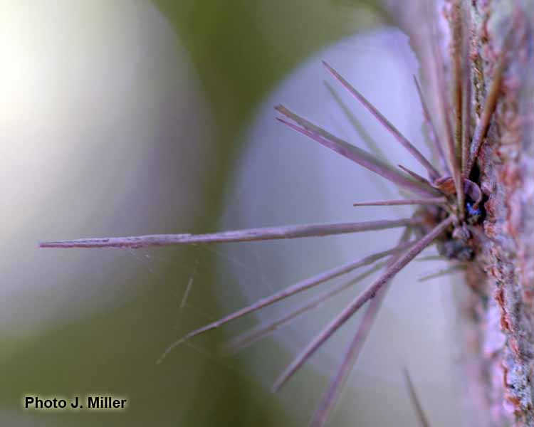 Tree to 15 m tall. Bark dark brown to reddish brown to gray, rough; the older branches and the trunks of young trees usually bearing clusters of fusiform to aciculate, straight stipular spines to 30 mm long clustered on short shoots. Twigs gray to dark reddish-brown, not flexuous, puberulent. Short shoots commonly present above the stipular spines, to 2 mm long, covered with acuminate stipules and old leaf bases; these sometimes elongating to branches to 12 mm long, with scattered leaves. Leaves alternate, also commonly clustered on the short shoots, 2-13 mm long. Stipular spines light gray with a reddish-brown apex, symmetrical, terete, straight to slightly recurved, aciculate, to 7.5 x 0.9 mm near the base, puberulent. Petiole adaxially grooved, 0.9-5.4 mm long, puberulent; petiolar gland solitary, located just below the first pinna pair, columnar, 0.3-0.8 mm long, glabrous, commonly inclined toward the apex of the petiole, apex circular to elliptical, 0.2-0.7 mm across, depressed. Rachis adaxially grooved, 0-7 mm long, puberulent, lacking a gland between the terminal pinna pair. Pinnae 1-2 pairs per leaf, 8-32 mm long, 2-7 mm between pinna pairs. Petiolules 0.5 to 1.3 mm long. Leaflets 8 to 17 pairs per pinna, opposite, 0.5-2.3 mm between leaflets, oblong to elliptic-oblong, 2.6-8.2 x 0.6-1.9 mm, glabrous, lateral veins obvious, only one vein from the base, coriaceous, base oblique, margins minutely ciliate, apex acute to obtuse. Inflorescence a densely flowered globose to subglobose head, 5-8 mm across, in fascicules of 1 to 5 from the short shoots. Pedicels 4-14 x 0.4-0.7 mm, villous with orange hairs. Involucre 4- to 5-lobed, located 1-2 mm below the base of the globose head, lightly puberulent, persistent. Floral bracts broadly spatulate, 0.5-0.8 mm long, sparsely puberulent, more or less persistent. Flowers sessile, yellowish-orange; calyx 5-lobed, 0.7-1.1 mm long, glabrous or nearly so; corolla 5-lobed, 1.5-2.3 mm long, glabrous or nearly so; stamens 18 to 27, filaments 3.8-4.5 mm long, distinct; ovary densely pubescent, on a stipe to 0.2 mm long. Legumes dark blackish brown to dark brown, straight to slightly curved, elliptic to terete in cross section, not constricted between the seeds, oblong or nearly so, 27-60 x 8-18 mm, coriaceous, not striate, glabrous and lustrous, eglandular, dehiscent along the ventral suture; stipe 1-2 mm long; apex obtuse. Seeds uniseriate, surrounded by a reddish-brown pulp, light to dark brown, irregularly ellipsoid to ovoid, slightly flattened, 3.3-4.9 x 2.1-3.6 mm, smooth; pleurogram oval, 2.1-2.8 mm across. Flowers in February.Chromosome number unknown.