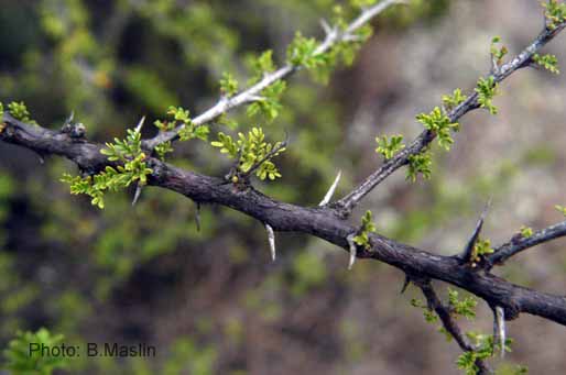 Shrub to 2 m tall. Bark dary gray, smooth. Twigs dark reddish brown to gray, not flexuous, lightly appressed puberulent, sometimes slightly glutinous and with dark purple, sessile glands. Short shoots commonly present above the stipular spines, to 3 mm long, covered with acuminate stipules and old leaf bases. Leaves alternate, also clustered on the short shoots, 2-9 mm long. Stipular spines reddish brown, becoming light gray with age, symmetrical, terete, slightly recurved, stout, to 17 x 1.3 mm near the base, glabrous to lightly puberulent. Petiole adaxially shallowly grooved, 2-5(7) mm long, lightly puberulent; petiolar gland solitary, located between to just below the lower pinna pair, sessile, circular, 0.2-0.4 mm across, doughnut-shaped, glabrous. Rachis adaxially shallowly grooved, 0-7 mm long, puberulent, a sessile, doughnut-shaped gland 0.1-0.3 mm across between the upper pinna pair. Pinnae 1 to 2(3) pairs per leaf, 4-9 mm long, 1-4 mm between pinna pairs. Petiolules 0.4-1.2 mm long. Leaflets 4 to 9 pairs per pinna, opposite to subopposite, 0.6-1.2 mm between leaflets, elliptic to oval, 1.8-3.0 x 0.7-1.0 mm, mostly glabrous, lateral veins not obvious, only one vein from the base, base oblique, margins usually ciliate, apex obtuse. Inflorescence a densely flowered globose head, 6.5-9.0 mm across, solitary or in small clusters of 2 to 5 on the short shoots. Peduncles 9-20 x 0.4-0.6 mm, lightly puberulent. Involucre bracts 4 to 7, scattered near the middle of the peduncle, lightly puberulent, usually early deciduous. Floral bracts spatulate, 0.9-1.4 mm long, lightly puberulent, deciduous. Flowers sessile, pale yellow; calyx 5-lobed, 0.8-1.1 mm long, glabrous or nearly so; corolla, 5-lobed, 1.7-2.2 mm long, glabrous or nearly so; stamen filaments 3.3-4.5 mm long, distinct; ovary glabrous and glandular, sessile or on a stipe to 0.2 mm long. Legumes dark reddish-brown, straight to slightly curved, flattened, more or less constricted between the seeds, linear, 40-95 x 4.8-7.5 mm, chartaceous, not reticulately striate, glabrous and glutinous, covered with numerous dark reddish brown glands to 0.3 mm across and with stalks to 1.0 mm long, dehiscent; a chartaceous pericarpic strip lining each valve; stipe to 6 mm long; apex acuminate and usually beaked. Seeds uniseriate, no pulp, mottled gray-brown, oblong, strongly flattened, 4.5-7.5 x 3.0-5.8 mm, smooth; pleurogram U-shaped, 0.6-0.9 mm across. Flowers in March to July. Chromosome number: 2n = 26 (Parfitt 1979).