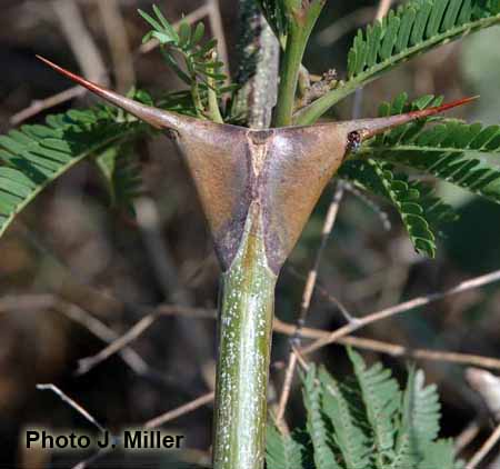 Tree to 13 m tall.  Bark dark brown to gray, shallowly furrowed.  Twigs reddish brown to dark brown, not flexuous, glabrous to rarely lightly puberulent.  Short shoots absent.  Leaves alternate, 45-180 mm long.  Stipular spines light brown to nearly black, sometimes light gray, symmetrical, flattened near the base, nearly flat to broadly U-shaped across the top, straight, stout and inflated, 30-55 x 10-20 mm near the base, glabrous to lightly puberulent.  Petiole adaxially grooved, 7-14 mm long, usually densely puberulent; petiolar glands (1-2)3 to 7, scattered along the petiole, sessile, narrow volcano-shaped to nearly columnar, apex nearly circular, 0.4-0.7 mm across, base 0.8-1.2 mm across, puberulent and lightly striateRachis adaxially grooved, 35-170 mm long, usually puberulent, a small narrow volcano-shaped to columnar gland located between each pinna pair.  Pinnae 10 to 18 pairs per leaf, 20-45 mm long, 5-12 mm between pinna pairs.  Petiolules 0.4-1.6 mm long.  Leaflets 12 to 30 pairs per pinna, opposite, 0.9-2.0 mm between leaflets, linear, 3.0-7.3 x 0.9-1.8 mm, glabrous, lateral veins not obvious, only one vein from the base, base oblique, margins lightly ciliate, apex obtuse; beltian bodies 0.5-1.0 mm long.  Inflorescence a densely flowered cylindrical spike nearly the same thickness throughout, 20-50 x 4-7 mm, in short, leafy racemose clusters with 1 to 3(4-8) spikes at each node in the axil of a reduced leaf.  Peduncles 10-20 x 0.6-1.1 mm, glabrous to lightly puberulent.  Involucre 4- lobed, located near the base to lower third of the peduncle, glabrous to lightly puberulent, persistent.  Floral bracts peltate, 0.4-0.7 mm long, apex circular and ciliate, deciduous.  Flowers sessile, yellowish; calyx 5-lobed, 0.5-1.1 mm long,lightly puberulent; corolla 5-lobed, 1.6-2.0 mm long, about twice as long as the calyx, lightly puberulent; stamen filaments 2.1-3.1 mm long, distinct; ovary glabrous, on a stalk 0.1 mm long.  Legumes black to dark brown, curved, elliptical in cross section, not constricted between the seeds, oblong, 40-100 x 8-12 mm, coriaceous, not striate, glabrous to lightly puberulent, eglandular, dehiscent along one sutures; stipe less than 5 mm long; apex acute, narrowing to a beak 10-15 mm long.  Seeds uniseriate, imbedded in a white pulp, dark brown, ellipsoid to rhomboid, slightly flattened, 4.5-7.8 x 3.3-5.0 mm, smooth; pleurogram oval to U-shaped, 2.1-3.4 mm across. Flowers in January to July.  Chromosome number:  Not determined.