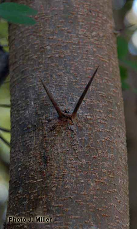 Tree to 15 m tall.  Bark dark gray to brown, shallowly furrowed.  Twigs dark purplish brown to dark gray, slightly flexuous, glabrous to lightly puberulent.  Short shoots commonly present above the stipular spines, to 8 mm long, covered with acuminate stipules and old leaf bases.  Leaves alternate, also commonly clustered on the short shoots, 4-30 mm long.  Stipular spines light to dark purplish brown, usually becoming light gray with age, symmetrical, terete, straight, thin, to 35 (50) x 1.5 (3.0) mm near the base, glabrous to lightly pubescent at the base.  Petiole adaxially grooved, 11-30 mm long, glabrous to pubescent; petiolar gland solitary, mostly located medially on the petiole, sessile, circular to elliptic, 0.8-1.8 mm long, apex depressed, glabrous to occasionally puberulent, sometimes absent.  Rachis absent.  Pinnae 1 pair per leaf, 15-35 mm long.  Petiolules 3-18 mm long.  Leaflets 2 (very rarely 3) pairs per pinna, subopposite to alternate, 5-18 mm between leaflets, ovate to obovate, terminal leaflets 10-40 x 9-30 mm, the lateral leaflets mostly smaller, glabrous to rarely lightly pabescent beneath, lateral veins obvious, 2 to 4 vein from the base, base oblique, margins usually ciliate, apex obtuse and usually mucronateInflorescence a loosely flowered elongated spike, 30-130 mm long, solitary or in clusters of 2 to 8 on the short shoots.  Peduncles 0-6 x 0.6-0.9 mm, glabrous to densely puberulent.  Involucre usually 4-lobed, at the base of the peduncle, the lobe apex ciliate the remainder glabrous, persistent.  Floral bracts spatulate, 0.7-1.2 mm long, puberulent, deciduous.  Flowers sessile, white to cream-colored; calyx 4-lobed, 0.7-1.4 mm long, glabrous and striated; corolla 4-lobed, 1.5-2.0 mm long, glabrous or nearly so; stamen filaments 2.5-4.0 mm long, distinct; ovary glabrous, on a stipe to 0.4 mm long.  Legumes dark reddish brown, straight to slightly curved, flattened, sometimes slightly constricted between the seeds, linear, 60-200 x 5-8 mm, coriaceous, reticulately striate, glabrous, eglandular, dehiscent; a chartaceous pericarpicstrip lining each valvestipe to 12 mm long; apexa cuminate and sometimes beaked.  Seeds uniseriate, no pulp, dark gray to dark brown, oblong, strongly flattened, 6.3-10.0 x 3.5-4.5 mm, smooth; pleurogram oblong to U-shaped, 1.1-2.0 mm across. Flowers in January to April. Chromosome number:  Not determined.